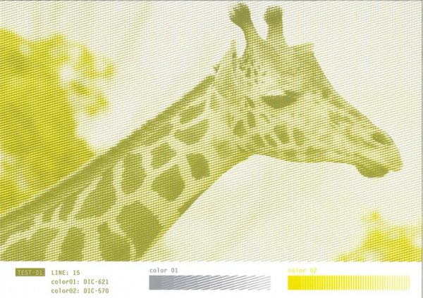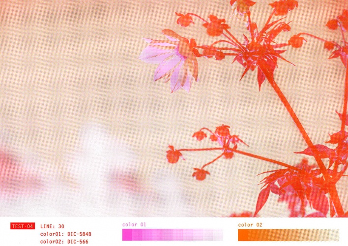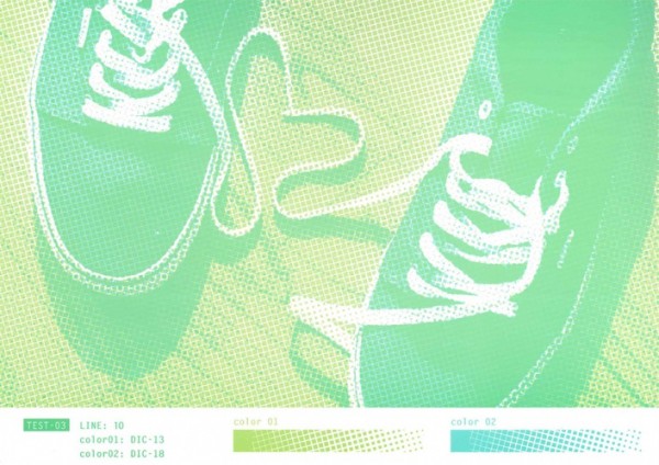 軽オフセットは2色までしか同時印刷できないので、今回は2色サンプルになりますが、これでも角度が変わっているのがわかると思います。網点の角度を変えることでも見え方が変わってくるので、幾通りもの表現ができてしまいます。