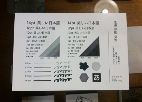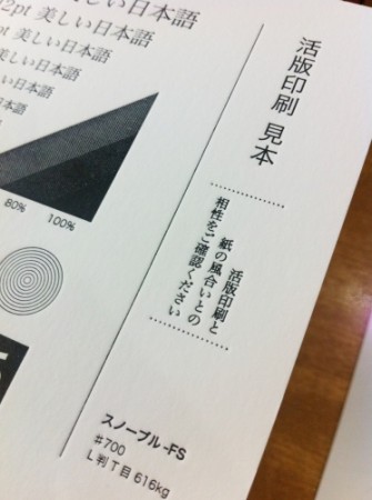 用紙メーカーのTAKEOから2015年9月末に新発売された「スノーブル-FS」で、活版印刷見本を印刷させていただきました。TAKEOさんサイトに掲載されている通りですが、「雪のように白く、ふわっとした手触り」で、クッション紙のような風合いがあります。