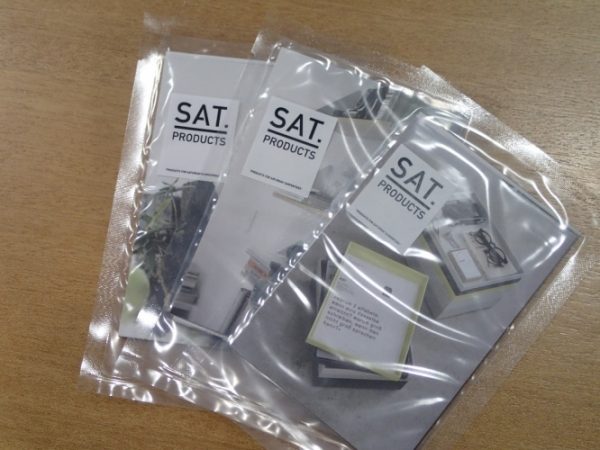ここ江戸堀印刷所の内装をしていただいた、straight design lab/東端桐子さんとcamp/大原温さんが、新たに「SAT.PRODUCTS」というプロダクトブランドを立ち上げられました。こちらの新製品を今回展示会に出展されるため、カタログカードを印刷させていただきました。